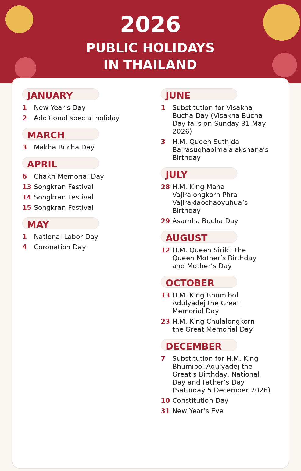 - Substitution holidays included in 2026: Monday, 1 June 2026 (for Visakha Bucha Day) and Monday, 7 December 2026 (for 5 December).