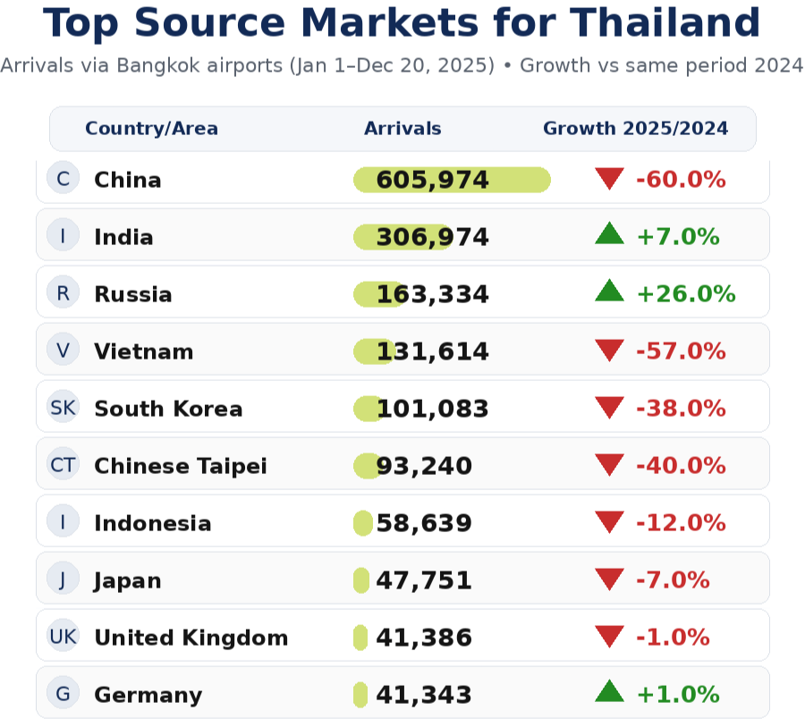 | Arrivals by Country/Area (Bangkok Airports, 2025) – ATTA | Comparison vs 2019 | ||||||