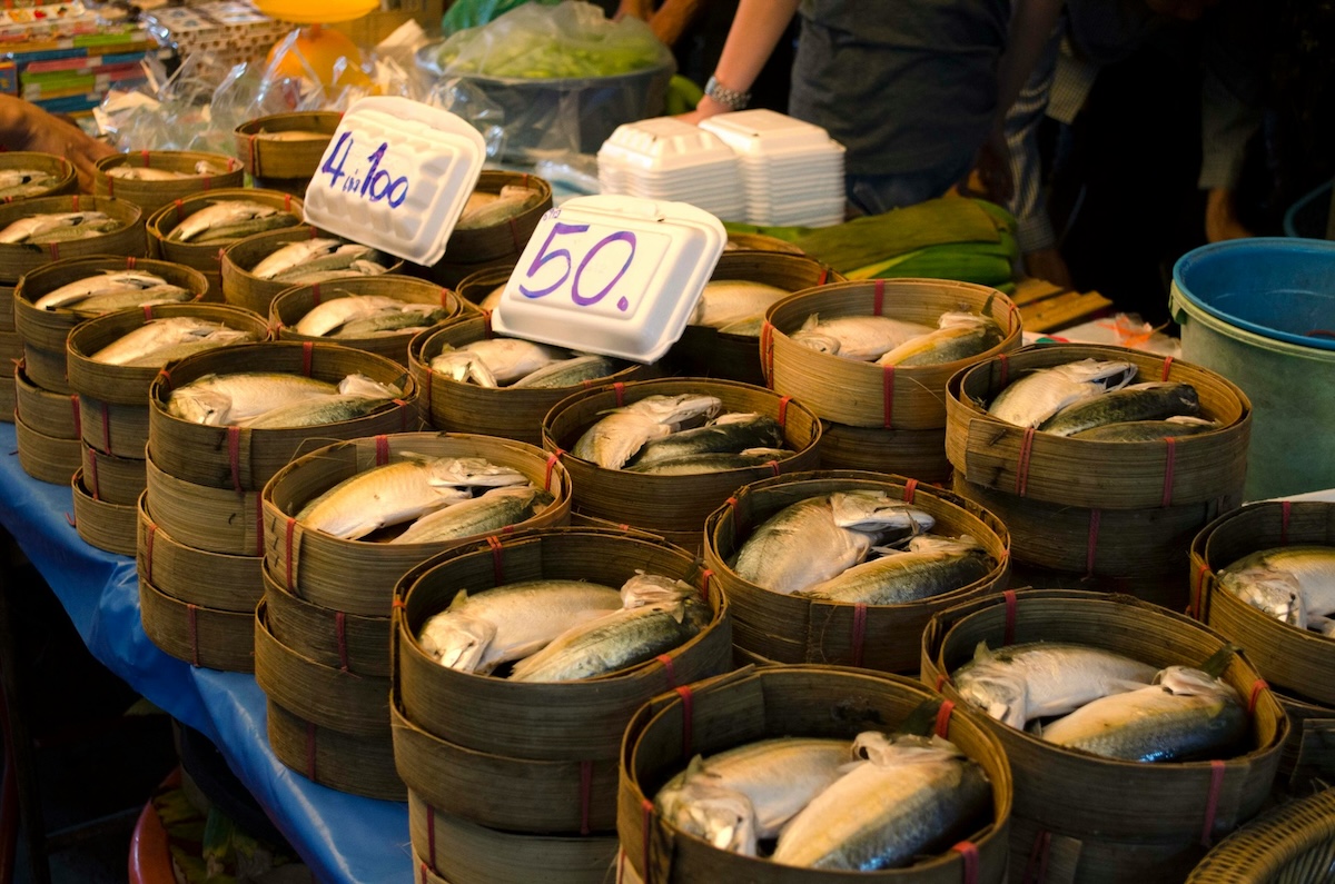Fresh fish baskets at a local market, neatly sorted and priced. (Source: Juan Montano via Unplash)